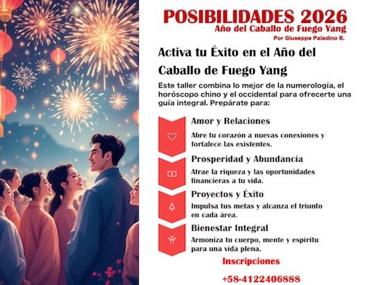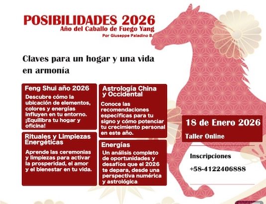 En este taller se combinará tanto la numerología por Feng Shui, el horóscopo chino y el horóscopo occidental, ofreciendo un análisis completo de las oportunidades y desafíos a los que cada participante se enfrentará en el 2026.