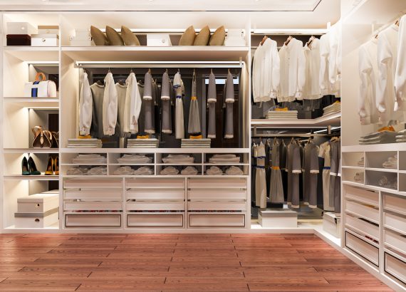 3d rendering luxury scandinavian wood walk in closet with wardrobe and make up table